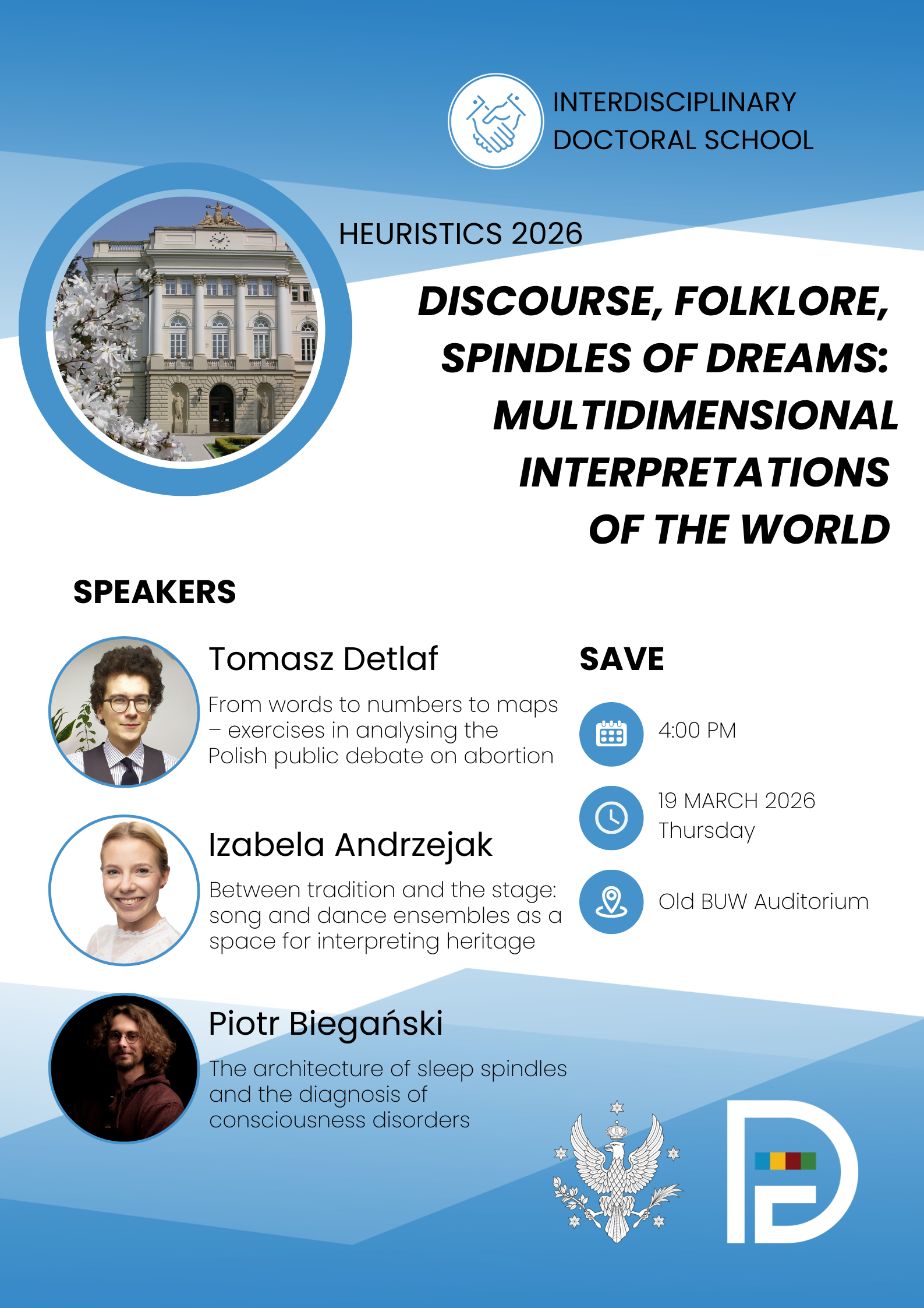 The event will begin on 19 March 2026 (Thursday) at 4 p.m. in the Old BUW Auditorium. We would be honoured if you would reserve this date and listen to the presentations of young researchers from the University of Warsaw.